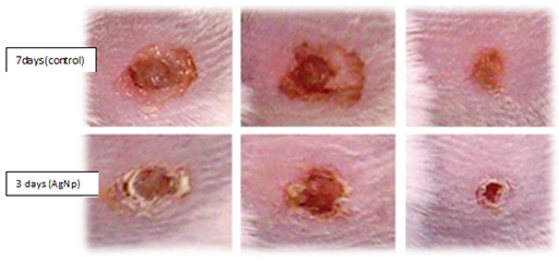 Silver-impregnated wound dressings have the potential to reduce both bio burden and healing time. This can be clearly observed in the picture below in Figure 5. Here the wound dressed by any normal ointment used as control was healed in 7 days, whereas silver nanoparticles impregnated ointment healed the wound in 3 days .28