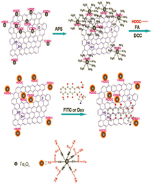 Yang et al.8 reported a dual-targeting drug delivery system based on multifunctionalized graphene oxide (GO) which was a pH-sensitive and controlled release system. Their target of this work was to improve the impact of targeted drug delivery and realize intelligently controlled release. They loaded Doxorubicin hydrochloride (Dox) onto the surface of this multi-functionalized GO via π–π stacking. They reported a saturation magnetization of 8.57 emu/g, The Dox loading capacity as high as 0.387 mg/mg in the case of the initial concentration of Dox at 0.238 mg/mL. Moreover, they claimed that their synthesized system’s release strongly depends on the pH value of environment.7 (Figures 6 & 7).