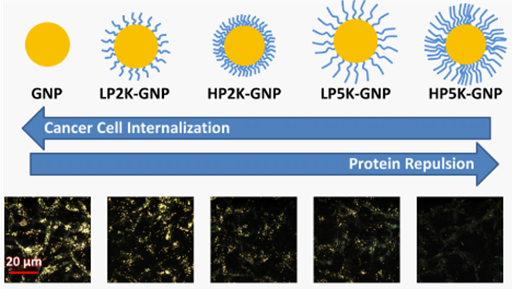 The trade-off between cellular internalization and nonspecific protein adsorption was observed in this study by varying PEG grafting characteristics on NPs, where GNPs were used as a model system (Figure 1). Grafting densities of 1 PEG/nm2 and 1 PEG/2 nm2 for two PEG chain lengths of molecular weights 2kDa and 5kDa were used to coat GNPs. In all cases, sufficient PEG molecules were grafted to achieve a brush conformation of molecules. Spherical GNPs with a diameter of 50 nm were used to investigate the effect of PEG grafting characteristics on nonspecific protein adsorption and cellular uptake in vitro in HeLa, MDA-MB-231 and MCF-7 cells. Quantitative results were also confirmed qualitatively by Hyperspectral Imaging (HSI) of NPs in cancer cells using Cyto Viva. The results of this study may be used as a guideline in designing inorganic NPs with prolonged blood circulation time and sufficient cancer cell uptake for potential clinical use.