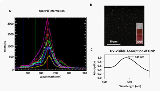 Imaging of NPs in cancer cells: Spectral information of as-made GNPs with varying intensities was collected as seen in (Figure 2). Varying intensities may have been caused by differences in distance so that NPs closer to the objective in the viewing plane had higher intensities than those farther from it. Using collected spectra from as-made GNP solutions as shown in (Figure 2), matches in MDA-MB-231 cells were imaged with SAM and it was confirmed that fluorescent particles were indeed GNPs (Figure 5). Observed fluorescence in acquired images of NPs in cells was found to generally agree with gold quantifications (Figure 6). An increase in the number of fluorescent particles was found to increase with uptake.