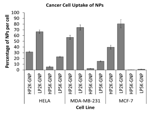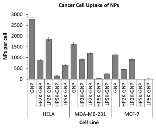 Quantifying internalization of NPs by cancer cells: Highest NP uptake was observed in HeLa cells across all NP types (Figure 3). Following this was the NP uptake by MDA-MB-231 cells, then MCF-7 cells. Despite differences in the amount o