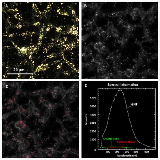 D) Intensity differences between the GNP, cytoplasm and extracellular regions display that observed bright particles were indeed GNPs.