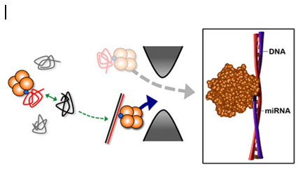 Nucleic acids as cancer biomarkers: Researchers at Wake Forest Baptist Medical Center.12 have developed a new technology to detect disease biomarkers in the form of nucleic acids, the building blocks of all living organisms (Figure 1). This is a potential first-line, non-invasive diagnostic to detect anything from cancer to the Ebola virus. The test could eventually be performed using a few drops of blood from a single finger prick. Nucleic acids consist of chains or sequences of bases stretching from just a few to millions of elements long. The exact order in which these bases are found, even over short distances, is strongly tied to their functions, and therefore can be used as direct indicators of what is going on inside cells and tissues. For example, one family of these nucleic acids known as micro RNAs (miRNAs) are only about 20 bases long, but can signal a wide range of diseases, including cancer. Although miRNA biomarkers have been studied for years, one problem has been their accurate detection because they are so short as many technologies had real difficulty identifying them. In this new technique, nanotechnology is used to determine whether a specific target nucleic acid sequence exists within a mixture and to quantify it through a simple electronic signature. If present, it forms a double helix with the probe just designed to provide a clear signal. By simply counting the number of signals, one can determine the extent of the surrounding target. The researchers first demonstrated that the technology could effectively identify a specific sequence among a background of competing nucleic acids, and then applied their technique to one particular miRNA (mi-R155) known to indicate lung cancer in humans. They showed that the approach could resolve the minute amount of miRNAs that can be found in patients. Next steps will involve expanding the technology to study clinical samples of blood, tissue or urine.