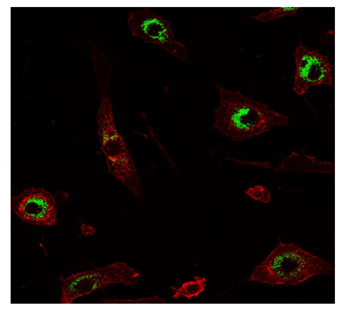 Figure 4 Mouse macrophages (red) engulf silica nanoparticles (green) 25.