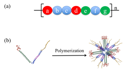 Figure 1 (A) A heptad repeat unit. Amino acid residues occupying a heptad repeat are denoted with a, b, c, d, e, f and g. Position ‘a’ and ‘d’ (in red) are usually occupied by hydrophobic amino acids. Position ‘e’ and ‘g’ (in green) are charged amino acids. Position ‘b’, ‘c’ and ‘f’ are random amino acids. (B) cartoon shows the principle of polymerization of monomeric peptide chains into nanoparticle, which is dictated by hydrophobic and ionic interactions among amino acid residues in position ‘a’ and ‘d’, and position ‘e’ and ‘g’, respectively. Image was adopted from Keba et al.21