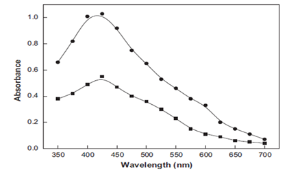 Figure 1 UV- Visible spectra of yellow color silver sol. Reaction conditions: [Ag+]- 200 x 10-4 moldm-3; [Oxalic acid]-4.0 x10-4 moldm-3; [CTAB]-10.0 x 10-4 moldm-3; Temperature -30 °C.