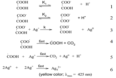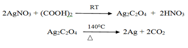 It is true that oxalic acid is a week acid and hence incompletely ionized but monoionic species (equation 1) will not be stable. It will lose the second proton forming C2O42- ion (equation 2) and subsequently react with silver nitrate to yield silver nanoparticles. Their claim that silver oxalate is not formed when silver nitrate is added to oxalic acid at room temperature at pH 3, is incorrect. We have experimentally investigated that when 10-3 M oxalic acid is mixed with AgNO3 or vice versa, a thick white crystalline precipitate is instantaneously formed which settles at the bottom of container. After standing for about 1 h it reduces silver nitrate to silver nanoparticles and carbon dioxide is released with a simultaneous change in color, according to the following reaction: