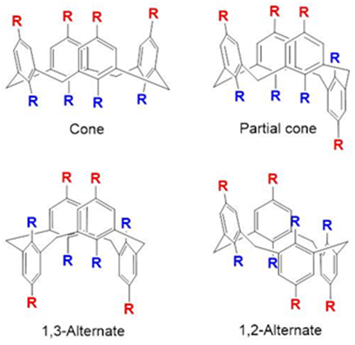 The most familiar and widely studied calix[n]arenes are the calix.4arenes, molecules which consist of four phenolic residues bridged by methylene groups. Besides the familiar cone conformation which presents a bowl-like cavity, calix[4]arenes can exist in several other conformations (Figure 2). Conceptually the bowl-shaped cone attracts the most attention in host-guest chemistry due to the obvious presence of an interior cavity. Many other studies of significance employ substituted calix.6arenes and calix.8arenes, which consist of six or eight phenolic residues joined through methylene bridges, respectively (Figure 3). Of course, as the number of phenolic residues within the calix[n]arene core structure increases so does the number of possible conformations. The greater number of rotatable bonds in these larger oligomers can present a challenge: for example, there are four possible conformations which can be adopted by calix.4arenes but this increases to sixteen for calix.8arenes, each conformation having different properties and, hence, potential for host-guest complex formation .18 Most studies into calix[n]arene facilitated drug solubilization have focused upon the synthesis of novel calix[n]arene derivatives bearing, for example, ionizable groups or rich functionality on either or both the upper and lower rims. Such calix[n]arenes are often amphiphilic and may self-assemble into larger networks in an aqueous environment, sometimes an advantage for solubilization of small molecules.19 Calix[n]arenes and calix.4resorcinarenes with more complex functionalities that also have biological activity and potential for solubilization have been reported, glycosylated calix[n]arenes and other multivalent calix[n]arenes for example.20-23