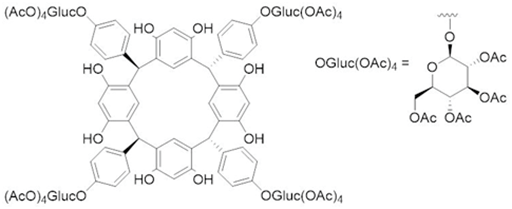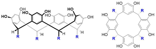 Calix.4resorcinarenes are a related class of cyclic tetramers prepared by reacting resorcinol with an aldehyde to give a cone-like structure (Figure 4).24 The key features of this class of compounds is that unlike the calix[n]arenes, which are prepared from the reaction of a phenol with methanal to form the methylene bridges, calix.4resorcinarenes can be prepared from the reaction of resorcinol with quite complex aldehyde precursors, usually in the presence of a suitable acid catalyst. For example, a glycosylated calix.4resorcinarene was readily prepared from the condensation of resorcinol with a glycosylated benzaldehyde (Figure 5).25 The calix.4resorcinarenes are often represented as a truncated cone functionalized on the upper and lower rims. However, a number of well-characterized conformations of calix.4resorcinarenes may be isolated and the distribution of these conformations depends upon the starting materials in addition to the reaction conditions used.26,27 It is possible to lock the calix.4resorcinarene into a cone-like structure by adding additional methylene bridges between the phenolic oxygen atoms on adjacent aromatic rings to form a generic structure colloquially known as a cavitand (Figure 6). This obviously removes some opportunities to functionalize the upper rim of the molecule but standard aromatic chemistry can be used to add additional functional groups and the lower rim can be decorated with diverse functionalities also. The chemistry and uses of calix.4resorcinarenes and cavitands has been described: cavitands and analogues form the basic structural unit of a widely studied series of supramolecular assemblies which have been used as hosts for small molecular species, molecular containers (carcerands) and catalysts.28-31
