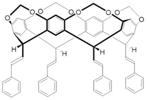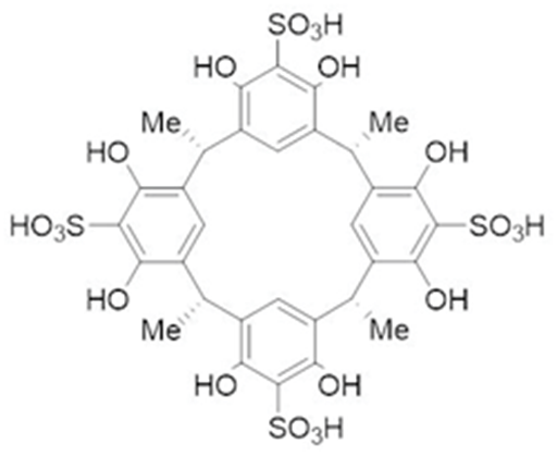 The potential of calix[n]arenes in drug solubilization has been demonstrated, particularly the para-sulfonatocalix[n]arenes. However, use of the corresponding calix.4resorcinarene analogues has not been studied so widely despite calix.4resorcinarenes being readily prepared and modified and also the focus of many studies in supramolecular chemistry. The solubility of the immunosuppressant mycophenolate mofetil was enhanced by host-guest complex formation with the readily available para-sulfonatocalix.4resorcinarene (Figure 9): mycophenolate mofetil is practically insoluble in water but in the presence of para-sulfonatocalix.4resorcinarene a 1:2 complex was formed which was markedly more soluble. In vivo studies also indicated that the toxicity of the drug was much reduced by complex formation .70 In a more recent report the para-sulfonatocalix.4resorcinarene was demonstrated to form a 1:1 complex with the common potent anticonvulsant drug lamotrigine; this was characterized using various analytical techniques and supported by molecular modelling. The complex was stabilized by hydrogen bonding and π-π interactions. The complex was also reported to display much reduced toxicity in animal studies when compared to the free drug .71