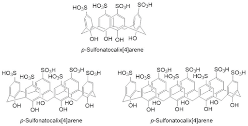 Para-Sulfonatocalix.4arene, para-sulfonatocalix.6arene and para-sulfonatocalix.8arene (Figure 7) were investigated for their potential to form complexes with testosterone in aqueous media. Predictably, para-sulfonatocalix.4arene formed a weak complex and measurements indicated that the steroid had not entered the hydrophobic cavity. The solubility of testosterone was enhanced by 1:1 complex formation with para-sulfonatocalix.6arene and para-sulfonatocalix.8arene, studied across a range of pH; it was noted here that the conformation of a para-sulfonatocalix[n]arene in solution may affect the stability of any complex formed. In fact, the solubility enhancement exceeded that which is observed when testosterone is complexed with β-cyclodextrin, demonstrating at this stage the great potential of sulfonatocalix[n]arenes.50,51