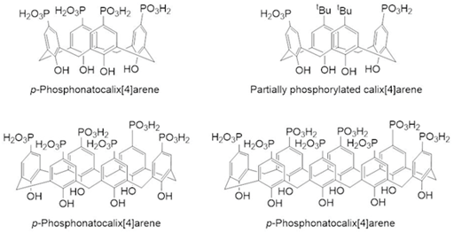 The fundamental properties and chemistry of calix[n]arenes functionalized with phosphonate groups has been described.63 They have been demonstrated to form complexes with small molecules due to non-covalent interactions, specifically those which exploit the phosphonate moieties. The sodium salts of para-phosphonatocali.4arene, para-phosphonatocalix6arene, para-phosphonatocalix.8arene and a partially phosphorylated calix.4arene bearing two tert-butyl groups (Figure 8) were investigated for their ability to also solubilize furosemide, nifedipine and niclosamide. Analyses indicated that each of the phosphonatocalix[n]arenes in this series formed 1:1 complexes with the drugs investigated. The aqueous solubility of both furosemide and nifedipine was increased greatly by complexation with the partially phosphorylated calix.4arene; in the case of furosemide the phenyl residue again occupied the central cavity. Niclosamide was solubilized by complex formation with para-phosphonatocalix.4arene and para-phosphonatocalix.6arene with experimental data again indicating that the substituted aryl residue becomes embedded within the calixarene cavity; this is particularly interesting because the polar nitro group is also taken up by the cavity .64,65