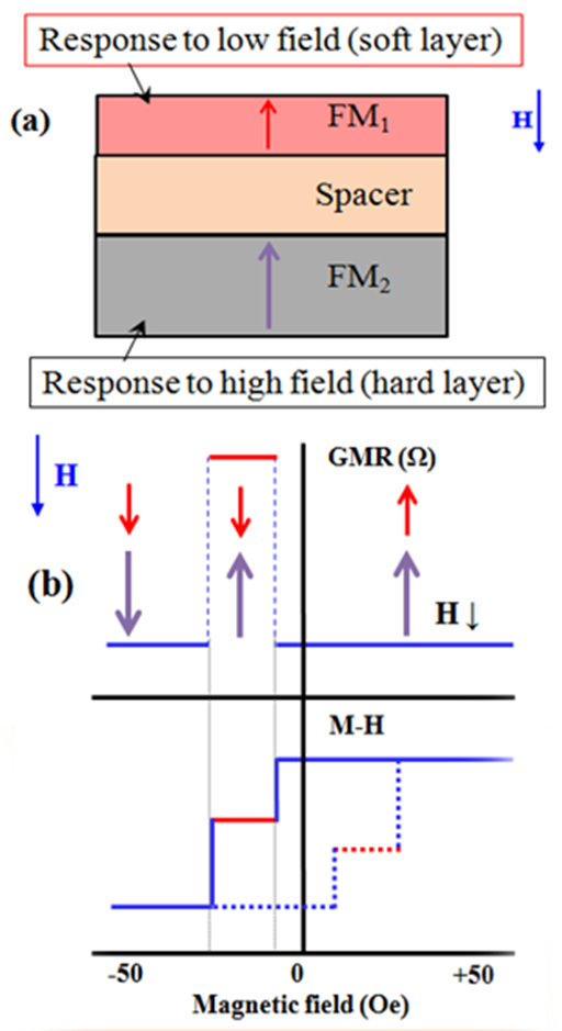 The GMR effect can be observed and controlled in magnetic metallic tri-layers as two ferromagnetic (FM) layers separated via a normal metal (spacer), called spin-valve, as shown schematically in Figure 1a. Thickness of each layer should be around a few nm to prevent the bulk spin scattering in layers. The metal in spacer layer can be Cu or Ag, etc. with a few nm thickness and if the spacer is made of an ultra-thin insulating layer, e.g. MgO, with thickness around 1 nm, the device is called the magnetic tunneling junction (MTJ). This device has much greater magneto resistance changes based on tunneling phenomenon and is called the tunneling magneto resistance (TMR) effect. Hereafter we use the magneto resistance (MR) instead of either of GMR or TMR elements. In the MR stacks, each FM layer can have either in-plane or out-of-plane magnetic anisotropy to make in-plane.13,14 out-of-plane.20 (Figure 1a) and orthogonal.10,12 magnetization counterparts. Magnetic properties of FM layers in this stack may have different switching field. The one which saturates in a small field is called the soft layer and another FM layer which needs larger magnetic field to be saturated is called the hard layer. Because of spin dependent scattering at the interface of FM layer, the resistance of this stack is a function of applied magnetic field. Figure 1b shows the resistance and magnetization of the MR stack as a function of applied magnetic field. In a very simplified picture, when both FM layers have parallel alignments, the resistance is smaller than the case when FM layers are anti-parallel. Therefore, it is possible to design a magnetic field sensor based on the MR stacks. There are some important points that have to be taken into account to design and make a desired magnetic field sensor such as controlled magnetic coupling, hysteresis less, linear, thermally stable and low noise responses.3,7,20 All of these capabilities can be revealed via controlling the magnetic properties of FM layers and physical properties of spacer. Finally, it as to be noted that achieving to such reliable thin multi-layers in MR elements needs accessing to high quality deposition techniques as well as careful growth parameter control.