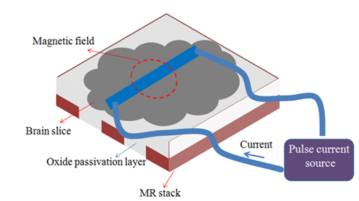 Figure 2 Schematic procedure of the fabricated MR stack array passivated with insulating layer. The mice brain slice was positioned on top and for actuating the brain, a current where passed through a wire inside the brain slice and a magnetic field can be generated. The MR stack is able to detect amplitude and time of the spatiotemporal induced magnetic field right after actuation.