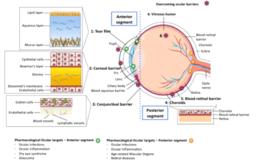 The topical ocular administration of drugs is the most common route to provide treatment for both superficial and intraocular diseases. Depending on the target sites of the different ocular pathologies, drugs either need to be retained at the cornea and/or conjunctiva(e.g., conjunctivitis, blepharitis, keratitis sicca) or cross these barriers and reach the internal structures of the eye (e.g., glaucoma, uveitis) (Figure 2). However, ocular bioavailability of the instilled drugs is known to be low (<5%) due to the many biological processes and physical barriers present in the eye.42,43 The drug, being diluted with the lachrymal fluid immediately after application, remains in the precorneal space for a very short period of time because of the continuous fluid drainage, the blinking reflex and the activity of metabolic enzymes, which may significantly degrade the drug molecules. During this time, drugs targeting the inner eye have to cross one of the barriers covering the eyeball: the cornea and/or the conjunctiva. The cornea is the transparent, dome–shaped front part of the eye that covers the iris and pupil. This structure is composed of an outer stratified epithelium which covers a thicker layer of collagen fibers in a glycoproteic matrix, and it is separated from the aqueous humor by the corneal endothelium.44 The cornea lacks blood and lymphatic vessels, so it would be the optimal way to deliver drug into the eye without systemic absorption. Unfortunately, the transport across this barrier is severely limited by the presence of tight junctions that hinder the paracellular pathway, followed by most of the small hydrophilic molecules administered as eye–drops. The conjunctiva is composed by a stratified epithelium which covers the eyeball (beginning at the outer edge of the cornea) and lines at the inside of the eyelids. This structure is more permeable than the cornea for drugs topically applied into the eye, but the entry through this way is normally associated with systemic drug absorption which leads to poor distribution in the ocular tissues and increases the risk for systemic side effects.45 Moreover, drugs intended to treat pathologies related to the back of the eye (eg. macular degeneration) have to diffuse through the vitreous humor, a gelled matrix of collagen fibrils and glycosaminoglycans, to reach the retina (Figure 2).
