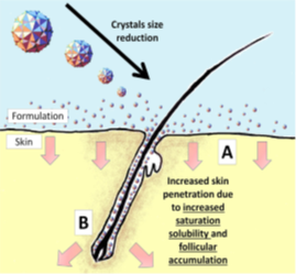 Nanocrystals with an appropriate size (approximately 700nm) can accumulate into these shunts, which act as a depot from which the drug can diffuse into the surrounding cells for prolonged release. In a novel interesting paper, Zhai produced nanocrystals with the aim of increasing the skin penetration of a medium soluble active such as caffeine. Moreover, they developed a specific production process, namely a low energy milling in low dielectric constant dispersion media and a selected stabilizer, which allowed to overcome crystal growth and fiber formation caused by super saturation and recrystallization effects, typical with medium soluble compounds. The novel concept introduced by Zhai, consisted of formulating nanocrystals from medium soluble actives, and applying a dermal formulation containing additional nanocrystals, which should act as fast dissolving depot, increase saturation solubility and accumulate in the hair follicles, to further enhance skin penetration. For this purpose, they produced caffeine nanocrystals with varied size ranging from 660 nm (optimal for hair follicle accumulation) to 250 nm (optimal for fast dissolution), by pear milling process inethanol/propylene glycol 3: 7 with 2% carbopol.