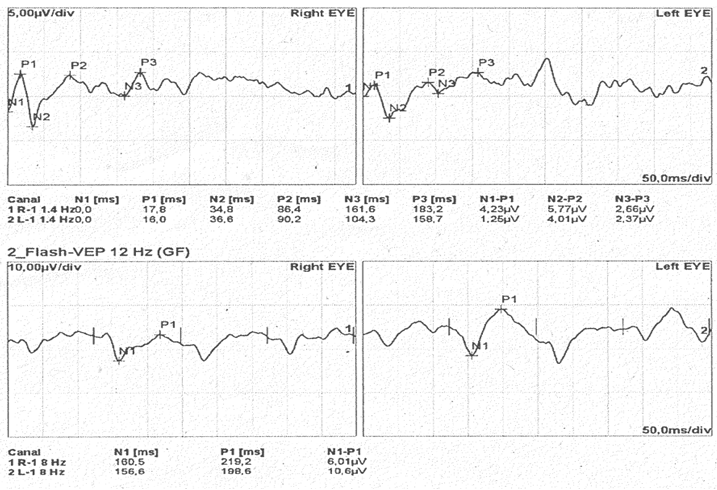 Because of optic nerve involvement, without any other documentable etiology in the paraclinical admission, the most likely cause was considered to be a side effect of pembrolizumab, which is why it was discontinued. The patient was treated with methylprednisolone 1 gram per day for 5 days without improvement, requiring treatment with plasmapheresis completing 7 days, with subtle improvement of light perception in the right eye. The patient was discharged and assessed 30 days after checkup without exhibiting clinical deterioration. Partial conduction in the optic nerves was evidenced in the visual evoked potentials taken at discharge (Figure 3). She was referred to undergo a bilateral phakectomy. She is currently scheduled for surgery.