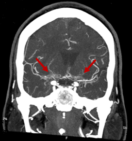 Despite the unclear CVD, the patient remained asymptomatic until September 2019 when she was admitted for left hemiparesis with dysarthria and conjugate deviation of gaze to the right. The computed tomography (CT) angiography showed a recent right parietal ischemic infarction, occlusion of the terminal portion of the right ICA and the M1 segment of the right middle cerebral artery, and marked stenosis of the terminal portion of the left ICA, the left M1 portion, and the A1 segments of the anterior cerebral arteries, with marked collateral circulation from the lenticulostriate and thalamus-perforating arteries with occlusion of the terminal portion of the ICA, demonstrating the moyamoya pattern (Figure 1 & 2). Progressive neurological deterioration culminated in the patient's death.