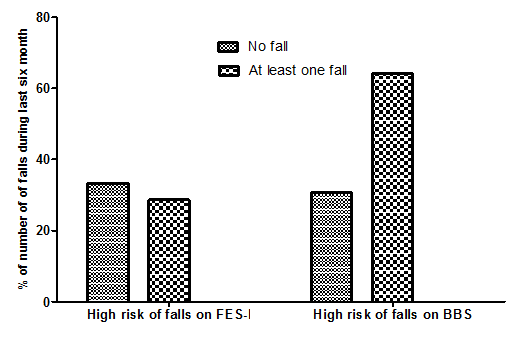 In FES-I, 33.3% subjects had no falling experience, but they were at risk during the last six months, whereas it was 28.6% those who had at least one time falling experience and FES-I was not significant for number of falls during the last six months (p 0.746). The BBS had a significant relation with the falling history during the last six months (p 0.029). Those who had never experienced a fall, they were at low risk of falling (only 30.6%), while, those who had at least one falling they were more prone to falling (64.3%) (Figure 1).