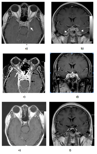 First row (a-b): Initial MR Brain images show evidence of inflammatory change largely confined to the cavernous sinus (short white arrowhead); the left cavernous sinus is enlarged (white arrow).