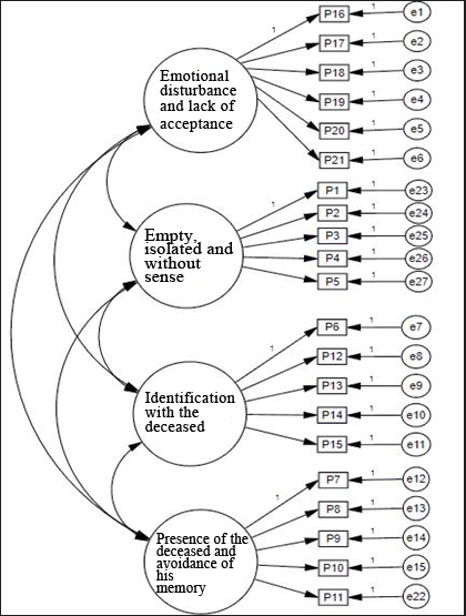 Reliability values were found for internal consistency with Cronbach's Alpha and McDonald's Omega of the inventory of the Colombian version total α= .879 and ω= .899, as in its 3 dimensions: "Emotional disturbance and lack of acceptance" α= .840 and ω= .840, "Emptiness, isolation and meaninglessness" α= .745 and ω= .745 and "Presence of the deceased, identification with him and avoidance of his memory" α= .817 and ω= .817, evidencing values11adequate and acceptable.12 With a reliability by internal consistency for the new total model α=.902 and ω= .902, with four dimensions: "Emotional disturbance and lack of acceptance" α= .840 and ω= .840, "Emptiness, isolation and meaninglessness" α= .820 and ω= .812, "Identification with the deceased" α= .813 and ω= .811 and "Presence of the deceased and avoidance of his memory" α= .801 and ω=.801 shows a high reliability.11