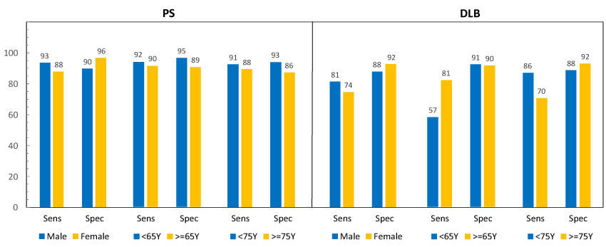 Conclusions: Sensitivity and specificity of ioflupane (123I) imaging was high in all age and gender subgroups, though statistically significant differences were observed with a slightly reduced, though still diagnostically useful, sensitivity above 75yrs. This reduced sensitivity may be due to increased frequency of mixed pathologies in older people, which makes the clinical diagnosis (reference standard) less optimal. In PS, sensitivity was higher in males, whereas specificity was higher in females. MLRM analysis demonstrated that all tested covariates (including gender and age) were significant predictors for sensitivity, but not for specificity.