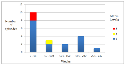 The occurrence of alarms was distributed between week 1 and week 242. The incidence peaks at week 12 of follow-up. The incidence of alarm events was 1.1% at the 6th week, and from 1.3% at the 12th week. Up to week 18 there had been 10 of the 20 alarm events (50%) observed in the follow-up period, including both alarms III, however alarm II did not occur until week 40.