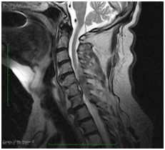 Figure 1 Sagittal T2 weighted image MR through cervical spine shows a heterogeneously hypointense dorsal epidural lentiform shaped lesion, between C4 to C7 levels causing cord compression and edema.