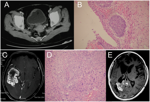 A 59-year-old female presented with a constant headache lasting for one week and was subsequently admitted. Two months before admission, she had suffered from invasive urothelial carcinoma, and a carcinectomy was performed to remove the bladder carcinoma (Figure 1A & 1B). In addition, no relatives of the patient had previously exhibited a similar disease. The physical examination of the patient revealed only slight disorientation, and no other obviously positive nervous system signs were observed at admission. A cranial MRI scans revealed right temporal lobe lesions suggesting the presence of a glioma or metastatic tumor (Figure 1C). We resected the tumor mass via surgery, and the post-operative pathological diagnosis was anaplastic astrocytoma (WHO grade Ⅲ, Figure 1D). The patient was then treated with combination chemotherapy (temozolomide and Nimustine) 6 times. An MRI rescan showed no obvious recurrence within 5 months of the operation, but a recurrence at the homolateral temporal horn appeared 7 months post-operation (Figure 1E). However, the patient refused further treatment and died 12 months after the glioma resection.