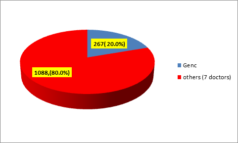 Length of inpatients stay is good indicator of patient care and Physician performance, considering this indicator in-hospital of patients overall stay of patient under Dr. Genc Struga care are lower comparing with other working colleagues in mean value 8.22 vs 8.51 with respective Std. Deviation respectively 7.5 and 9.1 as indicated in Table 3 and Figure 2. The overall of Dr. Struga is significant higher concerning the recover patient in the unit with 267 case or 20% of overall workload as shown in Figure 3.
