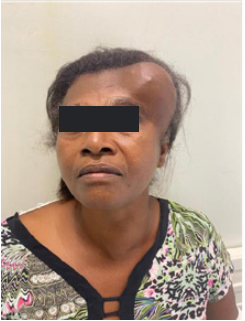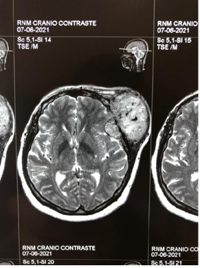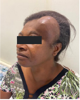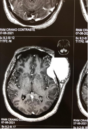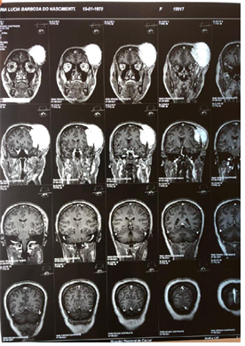 Patient arrived at the service of the Cacoal Regional Emergency and Emergency Hospital (HEURO) with hospitalization on 07/07/2021, 50 years old, female, black, with a previous history of controlled systemic arterial hypertension and reports a tumor in the left frontal region for about 3 years, visible and with an expansive mass. In view of this, a previous biopsy of oncotic aspiration cytology compatible with a benign follicular nodule (Category II-BETHESDA) was requested, where smears showing moderate cellularity were found at the expense of isolated follicular cells, sometimes aggregated amidst histiocytes, lymphocytes and neutrophils, on an amorphous background with a proteinaceous appearance, in addition to abundant colloid and numerous erythrocytes. The immunohistochemical examination showed the diagnosis of epithelial neoplasia of follicular origin and the anatomopathological analysis in the microscopy part showed the presence of an expansive lesion in the left frontal region suggestive of primary epithelial neoplasia with findings of irregular nuclei with clear areas and lumens filled with amorphous material eosinophilic. The macroscopic analysis showed 3 irregular brownish elastic fragments with dimensions of 0.5 cm x 0.3 cm x 1 cm. After performing magnetic resonance imaging, a left frontal extraaxial lesion with bone destruction was evidenced and the patient was immediately referred to a place in a reference service.