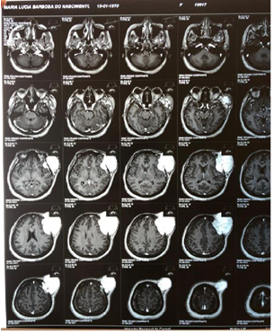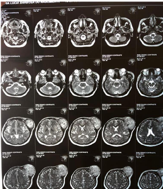 From antiquity to the present day, tumors have always aroused curiosity in the field of medicine and instigated science in an obsession to understand its mechanism of action and seek its cure. Neoplasms were initially described around 2600 years before Christ in an Egyptian papyrus containing reports of 48 cases of the disease carried out through the studies of the Egyptian physician Imhotep who, driven by the development of medicine, described the clinical manifestations of patients with aggressive tumors. It was only centuries later, with the Renaissance movement and the beginning of the modern age in the 18th century, that the first anatomical and histopathological descriptions were made thanks to the development of microscopy and the work of the German physician Virchow and the Belgian anatomist Andreas Versalius. Furthermore, with the advance of the scientific revolution in the 19th century, the factors related to the heredity of tumors as well as their understanding of genetic aspects were elucidated through analytical observations and categorical writings developed by the Austrian monk Gregor Mendel, which allowed the discovery of the influence of the genetic trait and the transport of these genes to the chromosomes, being later applied to the study of the modern genetic basis. Since then, with the advent of technology, hundreds of scientists have embarked on a maddening race to improve new techniques and innovative treatments that make it possible to understand and treat the mechanisms of the disease. In this context, epithelial neoplasms are known to be tumors that can be classified as benign or malignant, originating from a disordered proliferation of follicular cells in tissues, influenced by thyroid hormones.1 Benign follicular nodules are the most common types found in cases of neoplasms. epithelial cells presenting in their cytological analysis variable proportions of colloid and benign-looking follicular cells arranged as macrofollicles or macrofollicle fragments in some tissues of the body.2,3 Therefore, in the case report in question it was identified in a female patient with 50 years old, there is the presence of a left frontal extraaxial tumor visible in the appearance of an expansive mass caused by epithelial cells of thyroid follicular origin.