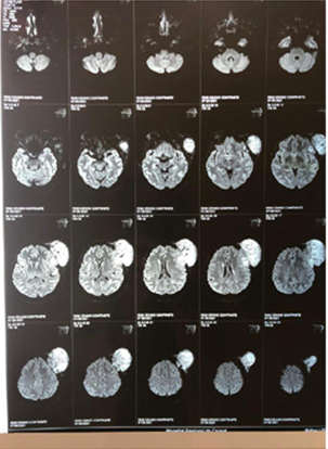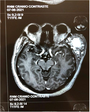 Figure 5A Contrast-enhanced magnetic resonance image showing a tumor in the extraaxial region of left frontal involvement with axial section.