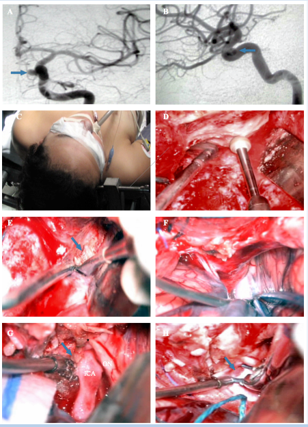 Case 1: A 27-year old woman presented in the office referring chronic headache. The initial screening with magnetic resonance imaging showed a carotid cave aneurysm. Further investigation with angiography (Figure 1) confirmed the diagnosis and the treatment options were proposed to the patient. Surgical treatment was chosen and a microsurgical clipping was performed (Figure 1) using a Dolenc’s approach to the clinoidal segment of the ICA. The patient was discharged on the fifth postoperative day without neurological deficits.