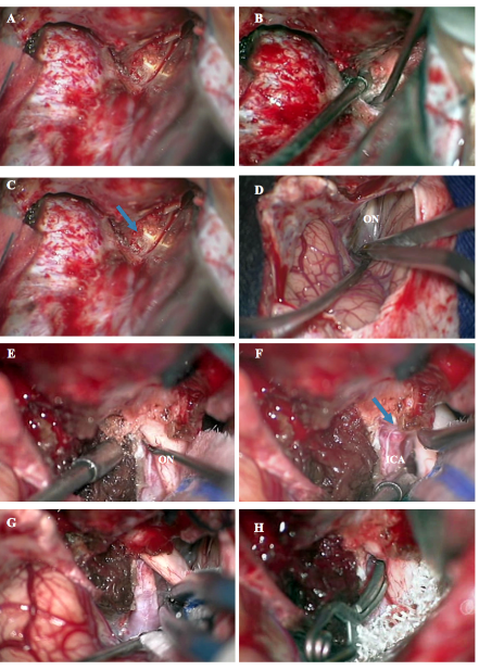Due to complicated osseous, dural and neurovascular structures (optic nerve, cavernous sinus, sella turcica) showed during dissection and cases, the surgery of the paraclinoid aneurysms presents special difficulties.3 The ACP usually is an obstacle in clipping these aneurysms. Some measures of the ACP show the average length from the level of cranial edge of the optic canal roof to the tip of the process of 7.7mm and 4mm of width. The visualization of the proximal ICA is increased without entering the cavernous sinus when the ACP is removed, exposing the distal C4, C5 and the proximal C6 segments of the ICA. The clinoid space is also better analyzed after the removal of the ACP.5,13