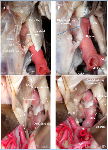 Conclusion: The ICA has a complex anatomy, especially when all the relationships with the nearby structures are considered. It is relevant to note that proximal control and anterior clinoidectomy are important strategies for managing the carotid cave aneurysms.