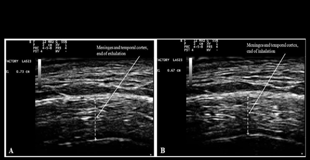 Since the chanting of Nam-Myoho-Renge-Kyo is characterized by a peculiar pattern of respiration with rapid inspiration and prolonged exhalation, the effects of breathing on brain movements are here reported. Morphology of brain structures was previously studied by the author and his colleagues using transcranial ultrasonography as described in Ruggiero et al.12s Bradstreet et al.13 and Ruggiero.14 Briefly, transcranial ultrasonography of the temporal lobe of the brain was performed using an Esaote MyLabFive (Esaote, SpA, Firenze, Italy) ultrasound system with a linear probe for muscle-skeletal examination (LA 523 by Esaote). The settings were adjusted for adult transcranial imaging as described in Ruggiero et al.12 The probe was positioned onto the temporal region of the head corresponding to the squama of the temporal bone, gently tilting it until the hyper-echoic line corresponding to the squama of the temporal bone was horizontal. The results depicted in Figure 1 were obtained at the Department of Human Anatomy, Histology and Forensic Medicine of the University of Firenze, Italy. These images are here reported, and their significance discussed, in the context of the object of this article. Figure 1 below is reproduced from Ruggiero et al.12 under the terms allowed by Firenze University Press. The rationale for investigating brain movements stems from the observation that breathing-induced alterations in brain water content influence sound wave propagation. Since the speed of sound propagation is directly related to the medium's water content, these transient changes in brain hydration modulate the transmission of sound waves within the brain.