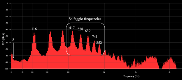 This study explored the effects of chanting Nam-Myoho-Renge-Kyo on sound frequencies, brain activity, and microbial metabolism. The findings provide preliminary evidence for interesting connections. The spectral analysis revealed several noteworthy frequencies generated during chanting. The presence of a peak around 8 Hz aligns with the first Schumann resonance, a natural electromagnetic field phenomenon. While the precise biological implications of this resonance on humans remain under debate, some studies suggest a potential link to physiological rhythms.37 Further investigation is needed to explore if chanting can synchronize with or influence these rhythms. The observed peak at 116 Hz aligns with a frequency previously linked to chloride ion movements.19 Additionally, the identification of five solfeggio frequencies is intriguing. While the historical and musicological basis of solfeggio frequencies is debated, recent studies suggest potential benefits associated with these frequencies, including stress reduction and cognitive improvement.22–24 These findings, if replicated with larger sample sizes, could contribute to the understanding of sound frequencies and their potential health impacts with particular reference to chanting Nam-Myoho-Renge-Kyo in the context of Nichiren Shoshu Liturgy.