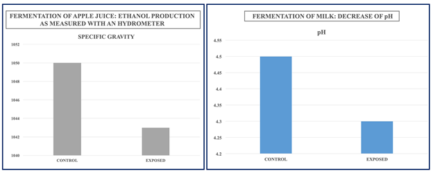 Figure 4 Cultures of probiotic fermenting microbes were exposed to the chanting of Nam-Myoho-Renge-Kyo for 30 min either directly in front of the practitioner, or at a distance. Exposure occurred after having dissolved the cultures in the media. Evaluation of the degree of fermentation was assessed after 24 hours (apple juice; left panel) or 48 hours (bovine milk; right panel). These results are representative of 3 other observations that gave qualitatively identical results.