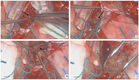 Figure 4 Surgical resection using standard microdissection techniques and image guidance. (A) The M1 segment was isolated. (B) After the circumferential dissection of the mass, an arterial afferent was discovered. The feeding pedicle artery was then isolated, terminating in the mass itself. (C) After the artery was divided, the mass was removed en bloc (D).