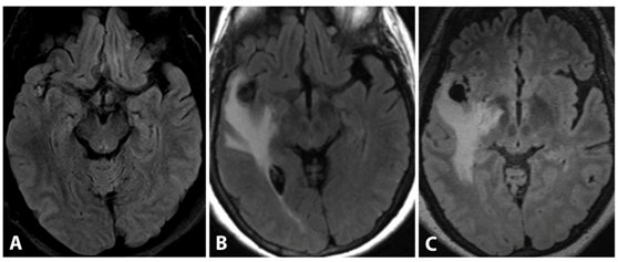 Figure 1 (A) Baseline axial T2 FLAIR MR image demonstrates a 6mm lesion adjacent to the mesial temporal lobe in the Sylvian cistern, immediately adjacent to the MCA bifurcation, with no significant associated edema. (B) Follow up at 5months demonstrates development of vasogenic extending into temporal white matter and temporal stem. (C) Follow up at 6months at a slightly cranial level demonstrates worsening vasogenic edema now extending as far medial as the internal capsule.