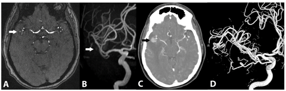 Figure 2 Baseline 3D time-of-flight MRA (A) and subvolume MIP MRA (B) images demonstrate mild T1 shortening without definite flow-related enhancement (white arrows). Delayed axial image from a CT angiogram at 5months (C) demonstrates interval increase in size to 6mm with delayed enhancement (black arrow). 3D volumetric reconstructions from a catheter selective right ICA angiogram at 5months (D) demonstrate no evidence of arterial flow to the lesion.