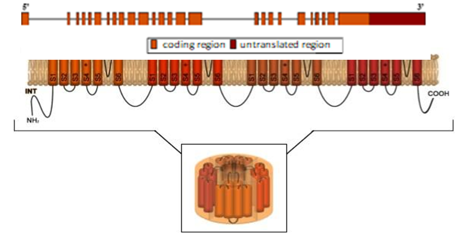 Discussion: The SCN1A gene has 26 coding exons and translates the subunit 1 of the voltage-dependent neuronal sodium channel protein (Nav1.1). This protein consists of four domains (DI-IV), containing six transmembrane segments each. The subunit of the sodium channel is responsible for the formation of the transmembrane pore that allows the entry of sodium ions into the intracellular medium of the neurons. It is known that there are more than 500 distinct mutations at SCN1A gene associated with the DS.