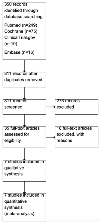 A total of 350 studies were identified and screened. Only 17 studies were assessed for eligibility and 7 studies were included in the quantitative synthesis (Figure 2). Primary outcome was extracted from each trial. Main characteristics of the trials are shown in Table 1. The quality assessments of each trial are summarized in Table 1. Randomization was done in all seven RCTs. Fifty-seven percent for the RCTs did not provide allocation concealment information. All of the included studies were blinded to observers. Four RCTs provided drop-out description.