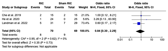 Recurrence of ischemic stroke (IS) at the endpoint: Three RCTs stated IS recurrence at the endpoint as a primary outcome. One hundred thirty-nine patients were pooled from 3 RCTs. Although the results are not significant, the forest plot (Figure 3) showed that RIC could reduce the recurrence of IS at the endpoint (OR 0.84, 95% CI [0.30, 2.29].