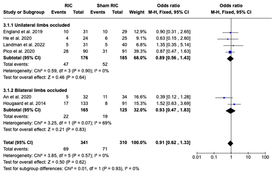 Modified Rankin Scale 0-2 at 90 days: Six out of 7 RCTs specified an mRS 0-2 at 90 days as one of the endpoints (OR 0.96 [0.67, 1.36]). Subgroup analysis was done between the number of limbs occluded (Figure 4). The unilateral limb occlusion subgroup favored the sham RIC while the bilateral limb subgroup favored RIC.