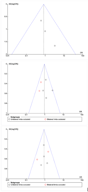 Upper plot: studies with recurrence of ischemic stroke at the endpoints, middle plot: studies with an mRs 0-2 at day 90, bottom plot: studies with an mRS 3-5 at day 90. There were some limitations in our meta-analysis. Studies with patients undergoing thrombolysis and thrombectomy were included in this review. Also, the studies which included thrombectomy did not indicate outcome of patients who were randomized to either RIC or sham RIC/control. The sample sizes of the two studies were larger than the rest of the study, which could potentially pose bias to the results. Also, subgroup analysis for the number of cycles and cycle duration was not explored.