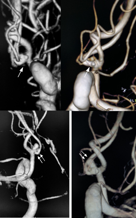 Figure 1 On day one of hospitalization 3D angiography showed some minor irregularity of the AComA close to the left A1/A2 junction (arrow) (A and B). At day 7, 3D angiography revealed an pseudoaneurysm on the AComA (double arrow) with arterial wall irregularities on the AComA and on the left A1/A2 junction (C and D)..