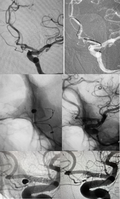 The complexity of this condition is reflected on published data and it’s pathophysiology still poorly understood. Histopathological analysis indicate that BLAs are not true aneurysms, as they lack intima and media, which results in wall fragility in a focal arterial segment. This characteristic suggest that they have acute dissecting etiology, which differentiates this group from typical saccular aneurysms.2,3 In morphological aspect they exhibit a poorly defined broad-based neck with a small aspect ratio and resemble a blood blister.1,2,3 Due to this combination, ruptured BLAs are hazardous and tend to regrowth and rebleed. The presence of acute configurational changes, as occurred in our case, makes treatment planning even more challenging and highlights the urgency of treating the lesion. According to Peschillo et al.,2 although they typically occurs at the dorsal wall of supraclinoid internal carotid artery (ICA) commonly at non-branching sites about 8.6% of the BLAs occur in atypical sites and the most frequent atypical site is the location we report here, the AComA. A systematic literature review conducted by Gonzales et al.4 indicates that BLAs are more frequently observed in females, at younger ages, and is associated with hypertension. These rare lesions remains a treatment and diagnosis challenge, as previously reported by Andaluz et al.,1 since, because of its small size, imaging exams, particularly CT angiography, lack sensitivity. Thus, catheter cerebral angiogram is nowadays a paramount exam, considered the gold standard in the context of SAH and negative CT angiogram findings. The most common clinical presentation of BLAs is SAH and some authors reported a 99% incidence.4,5 Still, BLAs might comprise one of the causes of angiogram-negative SAH, particularly when the distribution of blood on CT is non-perimesencehpalic.6 They are prone to dynamic changes in size and morphology and rates of regrowth and rebleed reach 15% and 23% respectively.4 For this reason, prompt diagnosis and treatment are mandatory. Therefore, repeated angiographies may be necessary to elucidate diagnosis.3 Besides its sensibility, 3D digital subtraction angiography (DSA) allowed us the observation of acute morphological changes in the context of minor irregularities and permited accurate measures which helped on treatment decisions. Our patient was initially reported as having a negative CT angiogram and a minor abnormality in the AComA on DSA. One week after, a 3D angiogram showed a pseudoaneurysm in AComA and irregularities in the left A1-A2 segment, and patient was submitted to urgent treatment. Concerning the treatment, there is no consensus about the optimal option and decision should be made case by case. Surgical techniques include parent vessel occlusion, clipping and wrapping-clipping. While endovascular strategies consist of parent vessel occlusion, coiling, stent assisted coiling and flow diversion.4,5,7,8 Small size and wall fragility disfavors isolated clipping or coiling. Wrapping is associated with occurrence of rebleeding. Parent vessel occlusion remains the simplest treatment, using either the endovascular or surgical approach when possible.1 However, it could not be our only strategy since there was a minor irregularity in A1/A2 segment and at this point this circulation is considered terminal, what could result in ischemic injury. Rouchaud et al,9 described a case of BLA in the AComA treated by endovascular exclusion of the artery using two FDS in which initial 3D digital angiogram reveled very small arterial wall irregularities (<1 mm) without a well-defined neck and these findings were considered to be BLA. Recently, the concept of endoluminal arterial reconstruction is becoming widespread and emerge as a option of a more physiological method, who maintains the patency of the vessel. FDS are being increasingly used to treat these aneurysms, with several clinical series supporting its use.4,8,9 A observational retrospective study showed some tendency for lower morbi-mortality rates and more favorable outcomes (mRs < 3) in endovascular group.7 Zhu et al.8 estimated occlusion rates in treatment with FDS of 79% with 13% of recurrence and 3% of rebleeding and mortality. Published data suggest that mid to longterm aneurysm occlusion rates are better and the need for retreatment is low with FDS,3 but its efficacy still needs larger series for validation. The two major disadvantages of FDS are the need of dual antiplatelet in the context of acute SAH and low initial occlusion rates.5 In our case, we decided to occlude the pseudoaneurysm with micro-coils due to its rapid growth and to performendoluminal reconstruction of the left A1/ A2 segments excluding AComA using a FDS, as we could not identify for sure which one of the irregularities corresponded to the bleeding lesion. Antiplatelet therapy must be cautious in patients with SAH due to the potential need for neurosurgical procedures in those subjects (i.e. craniotomy, ventricular catheter placement). Thus, it is recommended to perform ventriculostomy, if needed, before starting dual antiplatelet therapy for the purpose of avoiding hemorrhagic complications.1,9 However, this management is still controversial in the setting of acute SAH and one should carefully evaluate the risk / benefit profile of potential hemorrhagic and thromboembolic complications in deciding on such therapy.10