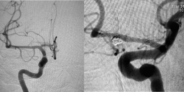 A 35-year-old previously healthy woman presented in emergency department complaining of severe headache, with a Grade 2 Hunt and Hess score. Neurological status was unremarkable. A computed tomography (CT) scan showed SAH (Modified Fisher Scale grade I) and the cerebrospinal fluid (CSF) sample showed 12.000 RBC/CC. Nevertheless, CT angiography did not depict any saccular aneurysm. Due to high suspicion, a three-dimensional rotational angiography was performed on day two, but showed only some minor AComA wall irregularities close to the left A1/A2 junction (Figure 1A). A second angiogram was performed 6 days later in order to elucidate the cause of the SAH and revealed a small pseudoaneurysm at this site (Figure 1B). Considering the acute morphological changes and the previous blending, we indicated urgent treatment. Microsurgical clipping occlusion of the AComA was discarded as an option since the lesion stretched out to the left A1/A2 segment. Since right A2 segment was supplied by right A1 segment, we decided to occlude AComA and the pseudoaneurysm with coiling and perform endovascular reconstruction of the left A1/A2 segments with a Flow Diverter Stent (FDS). The procedure was performed under general anesthesia and systemic heparinization (8000 IU during the procedure). The AComA occlusion was achieved with remodeling technique. A Scepter XC balloon 4 x 11m (Microvention Endovascular Inc., CA, USA) protected the left A1/A2 junction and three Microplex coils (Microvention Endovascular Inc., CA, USA) were detached through a Headway 17 microcatheter (Microvention Endovascular Inc., CA, USA). Finally, 2,5 x 14 x 20 mm Fred Jr Embolization Device (Microvention Endovascular Inc., CA, USA) (Figure 2) was placed through a Headway 21 microcatheter (Microvention Endovascular Inc., CA, USA), covering all the A1/A2 junction. Immediately after its placement, we administered intravenous abciximab 0.25 mg/kg bolus and maintenance dose for 12 hours. Dual antiplatelet therapy was initiated in the following day with clopidogrel 75 mg and aspirin 100 mg and kept for three months while aspirin was sustained for one year. External ventricular derivation was not required since there was no ventriculomegaly. Patient presented no evidence of new neurological deficits or complications such as rebleeding, regrowth, vasospasm, stent occlusion/stenosis or stroke. Control angiogram performed three months later confirmed exclusion of both pseudoaneurysm and the AComA (Figures 3) without any persistent arterial wall irregularity. Patient remained clinically stable with mRs 0.